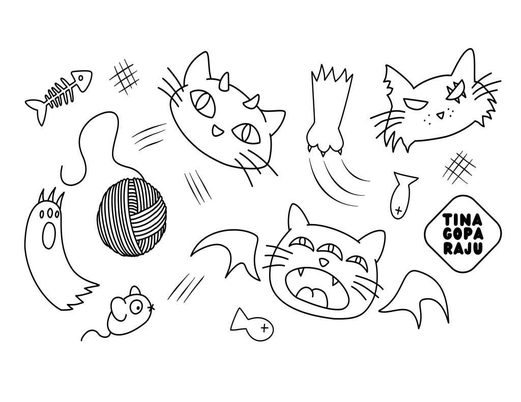 This month’s coloring page is based on a seamless pattern I’ve been working on, “Cats Outta Hell,” and I’ll be talking more about seamless patterns and my journey with this new interest in next month’s newsletter issue! For now, please enjoy these trouble-making cats ( 。 •̀ ᴗ •́ 。) ⋆⭒˚.⋆ If you color it in, be sure to send me your photo for the one and only TINY GALLERY!!!
